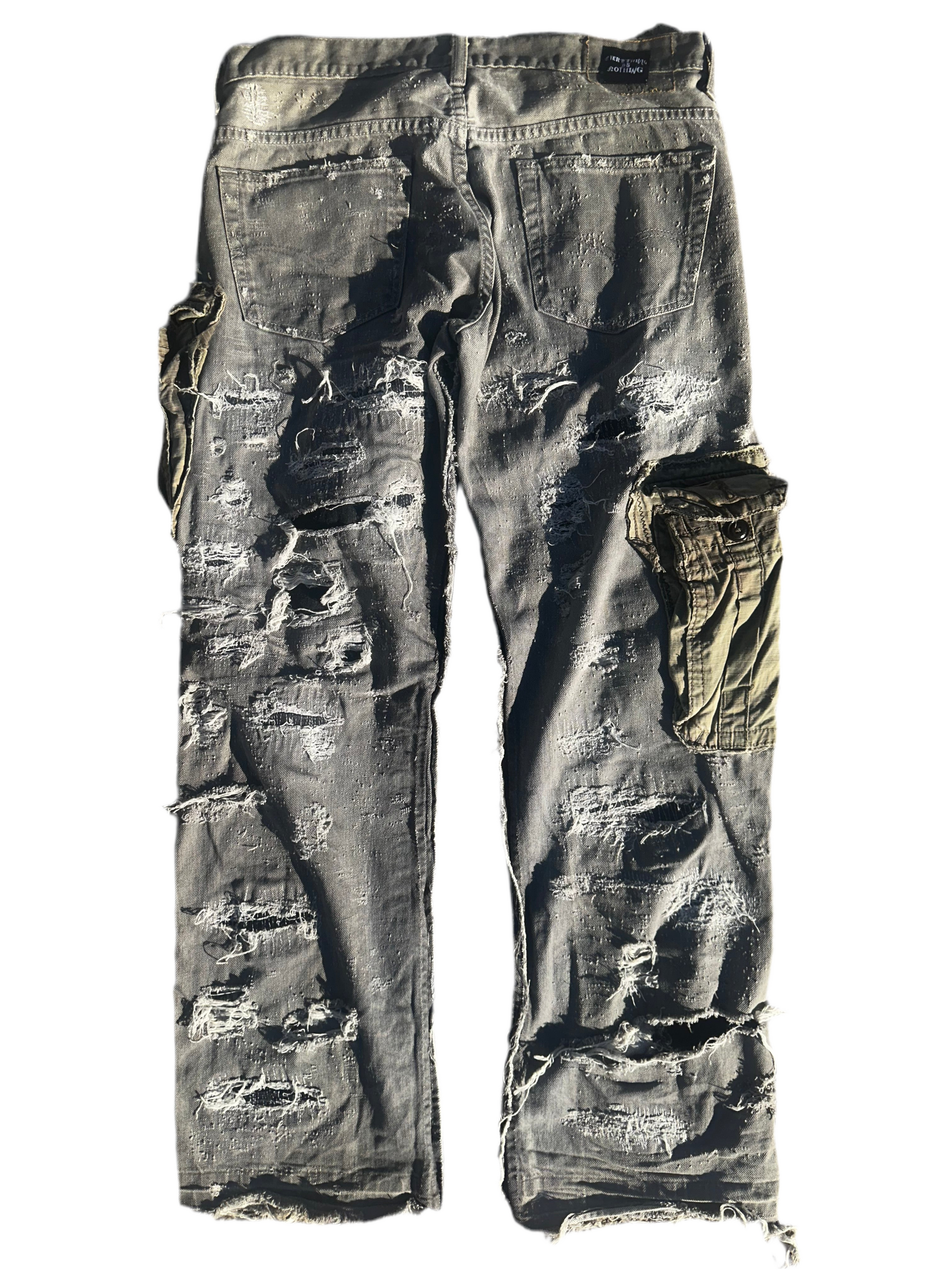 These 1/1 denim jeans were hand distressed and patched,featuring cargo pockets